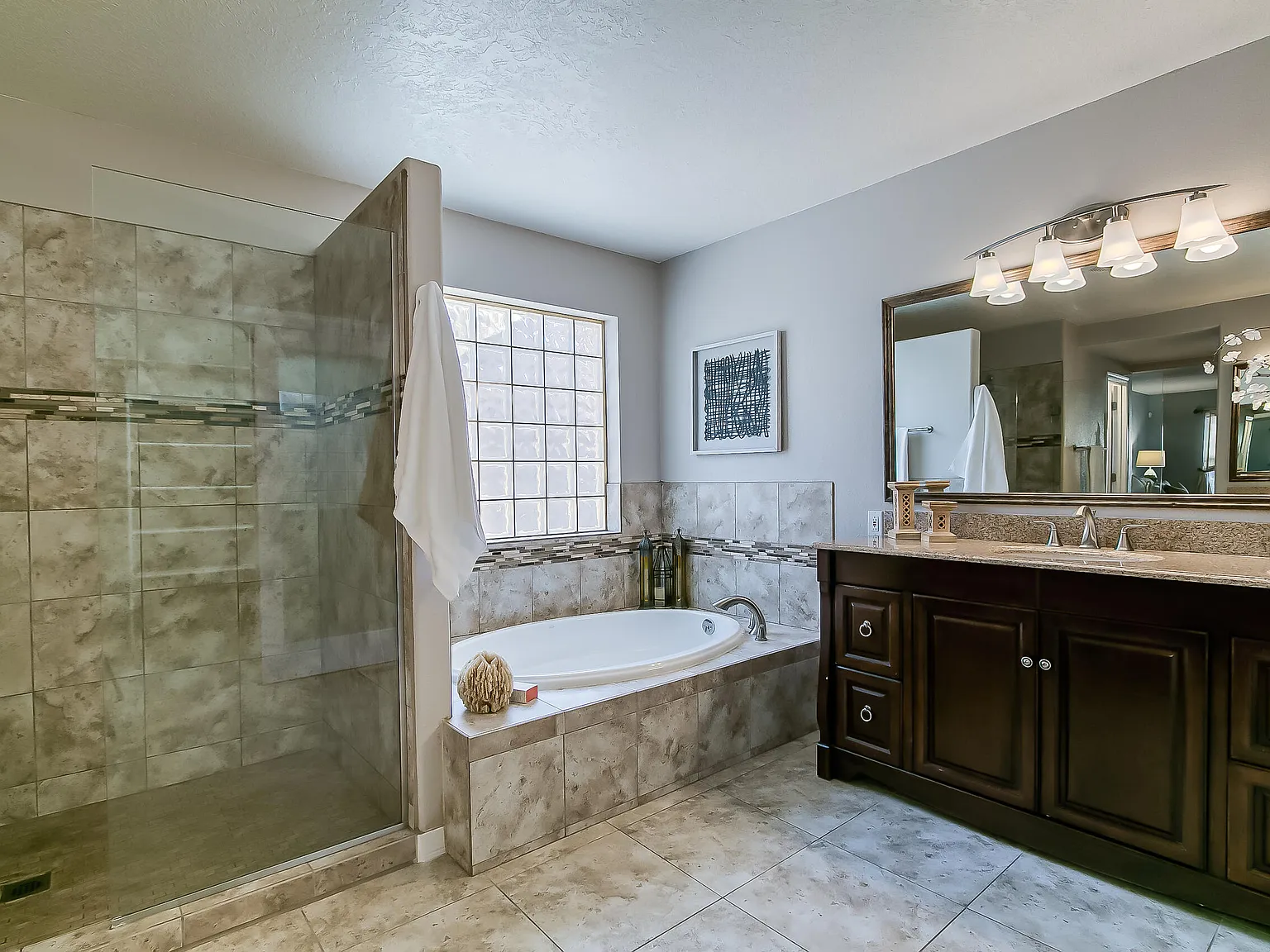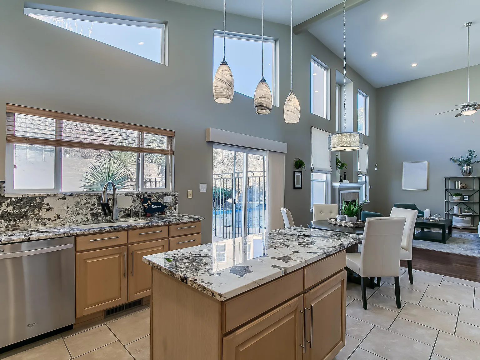 Fabulous 4 bedroom, 3 car garage home with a custom inground gunite swimming pool on a large Cul de sac lot in High Desert Albuquerque! This home features a open floor plan w/soaring cathedral ceilings & the owners suite downstairs. The kitchen includes updated level 5 Patagonia granite counter tops w/granite backsplash, monogram stainless steel appliances w/built in convection oven, 5 burner gas cooktop, convection microwave & ”ventahood” exhaust. The spacious owners suite features a updated garden tub, walk-in shower, dbl vanities w/granite counter tops & large walk-in closet. 3 large bedrooms upstairs & a deck w/mountain views. The extraordinary backyard is perfect for relaxing & entertaining with a gunite pool, built in hot tub, open & covered rear patio, sectioned off grass area.